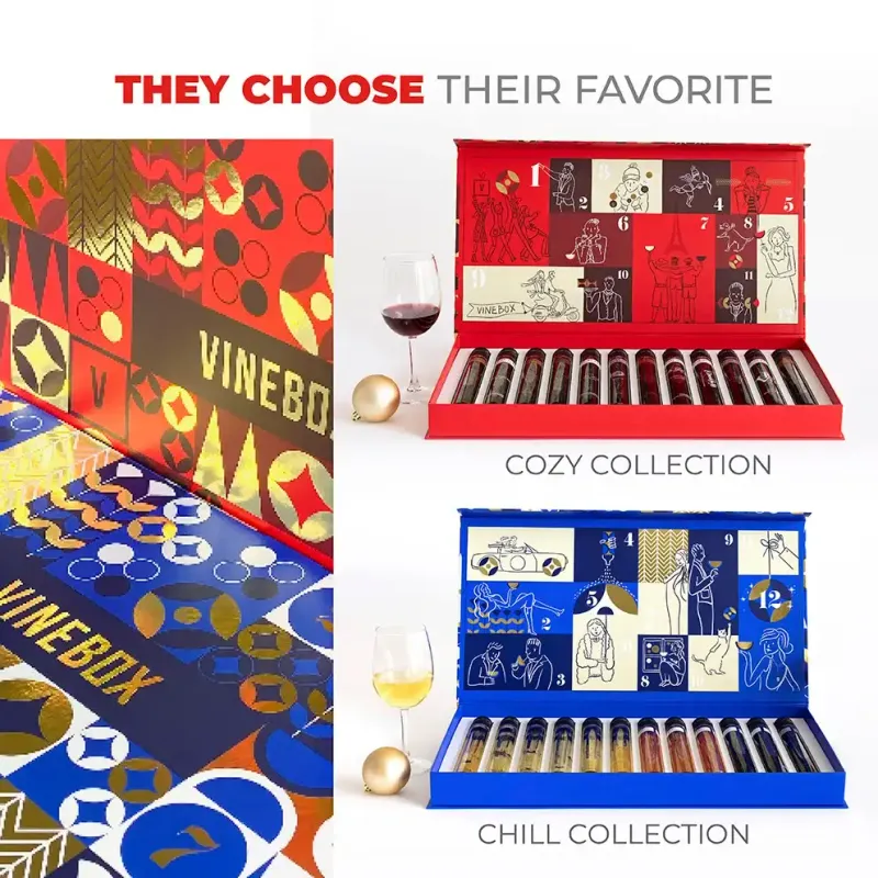 Wine Advent recipients will choose their favorite between 12 Nights of Wine Cozy or Chill Collections. All Advents will be delivered in stunning holiday packaging!