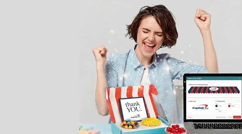 Upload your logo to Sugarwish in the Gifting Genie, and it's automatically applied to your branded email, eCard, gift selection interface, and note card — all included free with a corporate account. You can use our Design Suite to customize further with your brand's colors on the digital awning and custom cards.